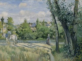 Pictured here are two paintings of the Pontoise countryside, one by Pissarro and one by Cézanne. Pissarro shapes the setting with a series of horizontal framings: the yard and trees in the foreground; a path, on which are a rider on horseback and a peasant woman and young child; next to the path is a river; on the other side of the river a line of trees and homes; and across the top a band of sky and clouds. Pissarro’s gentle brushstrokes and soft colors capture the effects of light and atmosphere. It is a scene of serenity, almost idyllic in its integration of nature and human habitation.